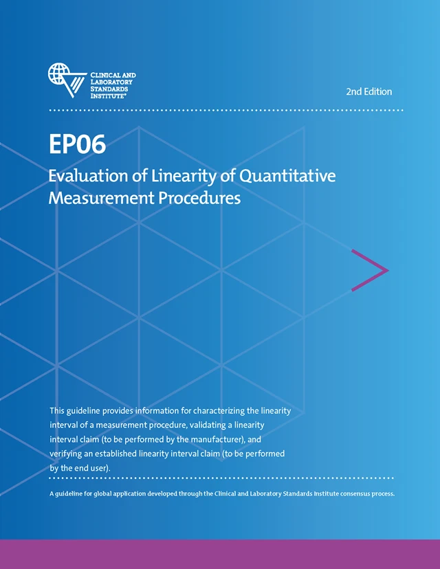 Clinical and Laboratory Standards Institute guideline CLSI EP06—Evaluation of Linearity of Quantitative Measurement Procedures is intended to provide both manufacturers and users of quantitative measurement procedures with an economical and user-friendly method of validating and verifying the linearity interval. This guideline also can be used to determine the extent to which a quantitative measurement procedure meets medical requirements or the manufacturer’s linearity interval claims.