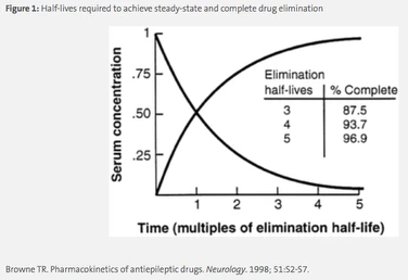 Elimination is the most important PK parameter for antimicrobials and is discussed in terms of total body clearance (CLT ) as the volume of blood removed of drug per unit time (eg; L/h). Almost all antimicrobials are primarily cleared through the kidneys and this is affected by the size of the drug, its protein binding, and the health of the patient’s kidneys. Clearance is used in part to determine the elimination half-life of the drug, which is the time it takes for the drug concentration in the body to be halved. Half-life is a more clinically useful parameter as steady-state, or the state in which drug concentration is in equilibrium in the body, occurs mathematically after 5 half-lives (eg, 50%, 75%, 87.5%, 93.8%, 96.9%, see Figure 1). The frequency at which a drug is dosed is therefore based in part on the half-life, and a typical rule of thumb is to dose a drug after at least 3 half-lives, or once ~87.5% of the dose has been eliminated from the body. For example, the half-life of levofloxacin in plasma is approximately 7.5 hours, therefore the drug is dosed clinically every 24 hours.2 Estimates of the patient’s clearance and subsequent drug half-life are used to make dosing adjustments for patients with increased or decreased renal function, including patients on dialysis.