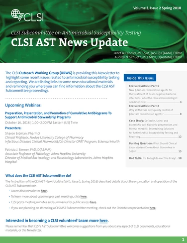 CLSI's Subcommittee on Antimicrobial Susceptibility Testing (AST) Outreach Working Group has published Volume 3, Issue 2 of their biannual AST News Update (Spring 2018).