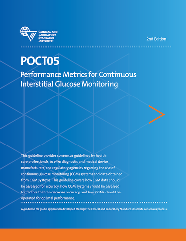 Optimal CGM system performance, as well as practical data comparisons between sensors, can be obtained by following the technical specifications presented in CLSI’s POCT05—Performance Metrics for Continuous Interstitial Glucose Monitoring. 2nd ed. POCT05 provides consensus information for health care professionals, in vitro diagnostic and medical device manufacturers, and regulatory agencies regarding how CGM data should be assessed for accuracy, how CGM systems should be assessed for factors that can decrease accuracy, and how CGMs should be operated for optimal performance. This guideline defines and explores multiple aspects of CGM performance, including use cases, point and trend accuracy, evaluation of threshold alerts, system stability and reliability, clinical studies for assessing CGM performance, calibration, and measurement traceability.