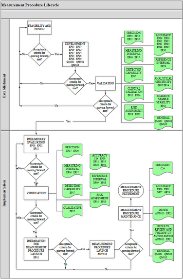Clinical and Laboratory Standards Institute offers a free document EP19—A Framework for Using CLSI Documents to Evaluate Clinical Laboratory Measurement Procedures that describes this lifecycle concept and serves as a reference guide for the use of CLSI documents for establishing and implementing IVDs. EP19 also explains helpful statistical concepts that are used in CLSI documents, including how they may be helpful in measurement procedure establishment and implementation. EP19 illustrates the usefulness of CLSI documents and provides helpful information for noncommercial laboratories that develop their own measurement procedures.