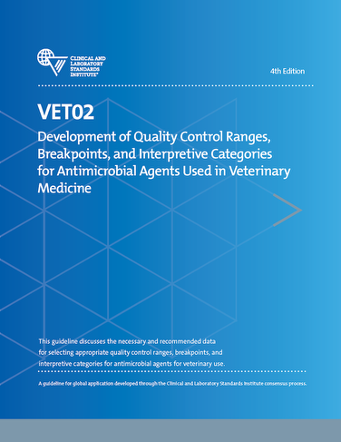 CLSI’s guideline VET02—Development of Quality Control Ranges, Breakpoints, and Interpretive Categories for Antimicrobial Agents Used in Veterinary Medicine provides recommendations for developing QC ranges, agar disk diffusion zones of inhibition breakpoints, and dilution minimal inhibitory concentration breakpoints for antimicrobial susceptibility tests for aerobic bacteria isolated from animals and performed by CLSI antimicrobial susceptibility testing standards. It describes the data used by the VAST Subcommittee to establish these QC ranges, breakpoints, and interpretive categories for antimicrobial agents intended for veterinary use.